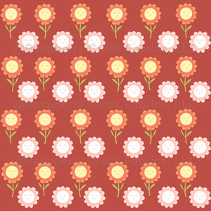 Cute, smiley-faced flowers in a playful spring colours on a red background. Perfect for kids' accessories, clothing, nursery decor and walls.
