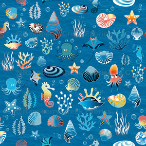 Sea shells, sea horses, starfishes, corals, sting rays and more in the warm summer water – perfect for playful bathing suits for kids.