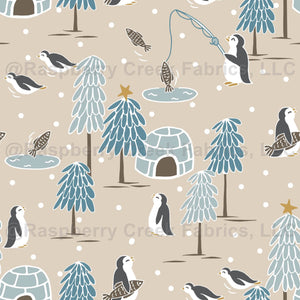Playful Snowy Winter Wonderland with Penguins and Christmas Trees in Beige Brown