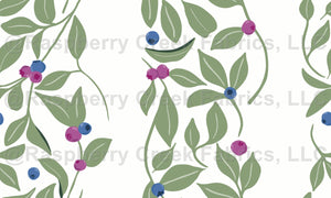 A hand-drawn vertical trellis design featuring citrus green leaves and blueberries. Ideal as a fresh, botanical coordinate to pair with bold floral prints.