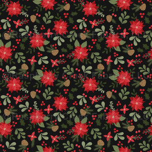 Poinsettia flowers with holly, berries, pine cones and holiday foliage on a black background