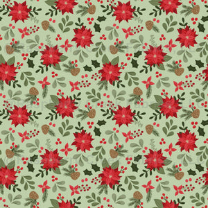 Poinsettia flowers with holly, berries, pine cones and holiday foliage on a green background