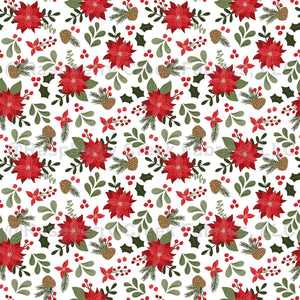 Poinsettia flowers with holly, berries, pine cones and holiday foliage on a white background