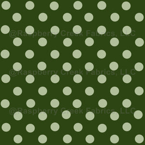 A repeating pattern of mint green polka dots is evenly spaced on an emerald green background. The design creates a vibrant and playful visual effect.