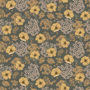 Yellow and cream poppies with lovely floral botanical bunches in mustard color and mauve color on a green color background. Refreshing Autumn Collection.