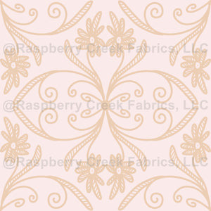 A symmetrical floral design in beige set against a muted blush pink background, featuring intricate leaves and swirl patterns surrounding stylized flowers. The repetitive motif creates a harmonious and balanced aesthetic.