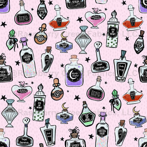 Potions, pink, girls, Halloween, hand drawn, fall, black, purple, blue, eye of newt, magic, whimsical, potion bottles, kids, women, home