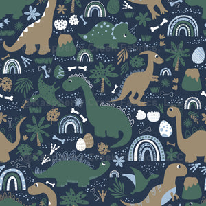 Prehistoric dinosaurs in green and brown and blue. Rainbows, botanitcal elements, flowers, vines, volcanoes and other dinosaur accessories surround various dinosaurs.
