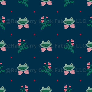 Preppy frogs with bow-tie and flowers on navy blue background, for kids clothing and accessories like bows and bibs.