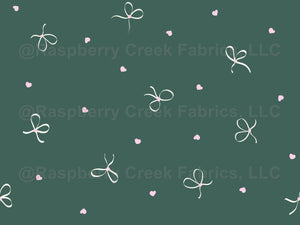 Preppy Hand-Drawn Tossed Bows and Tiny Pink Hearts in Dark Green- valentine