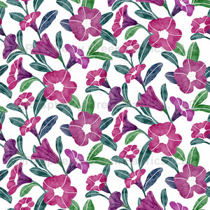 A hand-painted design featuring pink and purple morning glory flowers with green leaves on a white background, perfect for adding a fresh, botanical touch to fabrics and decor.