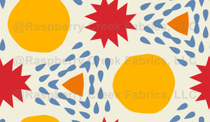 Primary Color Red Abstract Shapes, Yellow Circles + Blue Raindrops on Cream