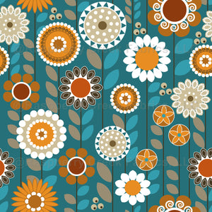 Pumpkin Spice, Folksy Floral is a folk art, botanical, garden with whimsical, Scandi flowers in cool blue-greens and spicy orange-browns.