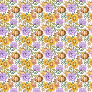 Purple asters, marigold sunflowers bloom around ripe pumpkins with the turning leaves of Autumn against an off white background.