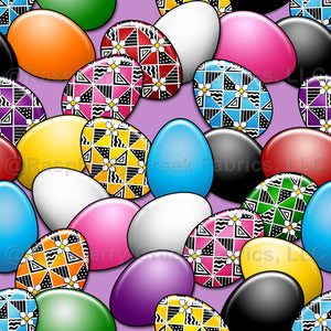 Pysanky eggs decorated with colorful triangles and stylized floral motifs nestle among scattered white and dyed Easter eggs on lilac.