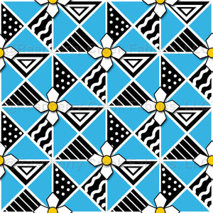 This folk art design featuring triangles and stylized floral accents on blue sky coordinates with my Pysanky Easter Eggs fabric designs.