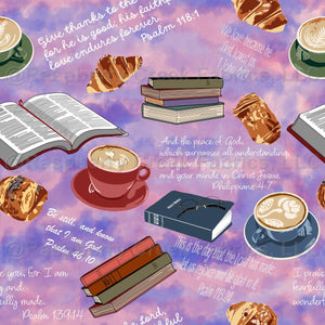 Quiet Time on a watercolor background - uplifting scripture, Bibles, coffee mugs, pastry - Coffee Time Collection