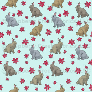 Little rabbits with small ears and big bushy tails in shades of tan, gold, and gray hang out among pinkish-red pimpernel flowers on aquamarine blue.