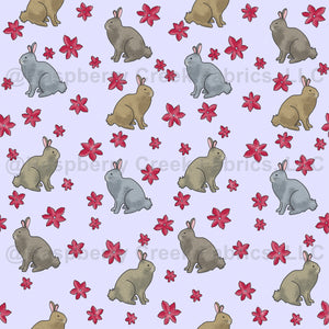 Little rabbits with small ears and big bushy tails in shades of tan, gold, and gray hang out among pinkish-red pimpernel flowers on lavender.