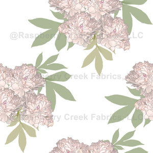 A beautiful repeating pattern featuring beautiful clusters of peonies and colored leaves set against a white background. The design is symmetrical and reflects a wallpaper or fabric print style, suggestive of interior decoration or textile design.