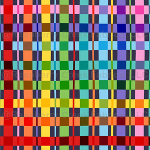 Colourful plaid with intersecting rainbow stripes on a dark background in a playful, balanced palette. A modern take on a classic check