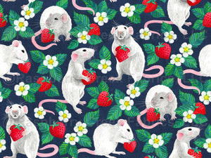 Lots of sweet rats with pink ears and tails having a happy midnight feast in a strawberry patch. Red, green, yellow, white and textured dark navy.