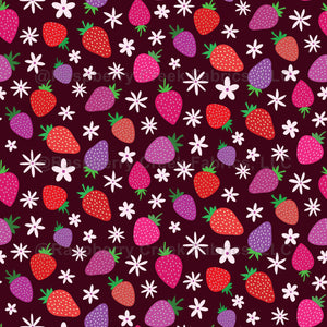 This is beautiful tasty strawberries in red, pink and purple with white retro flowers on dark background.