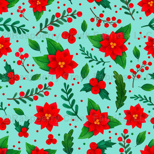 Red Christmas Poinsettia Flowers Holly Berries and Mistletoe on Aqua