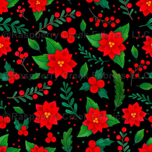 Red Christmas Poinsettia Flowers Holly Berries and Mistletoe on Black