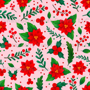 Red Christmas Poinsettia Flowers Holly Berries and Mistletoe on Pink