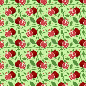 Bright Red Pomegranate Harvest fruit, hand drawn, with green leaves, swirly botanicals, and red pomegranate seeds. Light Green Background. Holiday, Christmas, Harvest, Fall, Autumn, Kitchen, Food, Fruit, Celebration, Hanukkah, Home Decor, Fabric