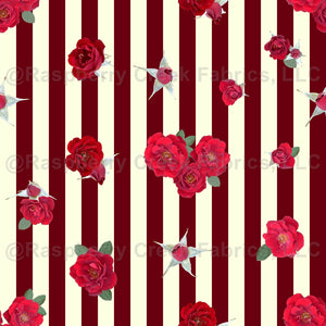 Scattered red roses and rosebuds create a lovely design on crimson red and cream stripes.
