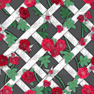 Gorgeous little red roses climb through a white lattice on Cracked Pepper.