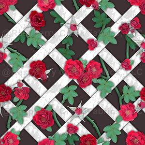 Gorgeous little red roses climb through a white lattice on Warm Charcoal.