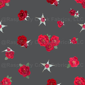 Scattered red roses create a beautiful design on Cracked Pepper (grey).