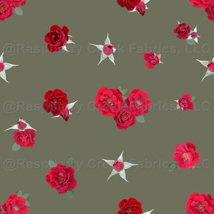 Scattered red roses create a beautiful design on Mountain Sage.
