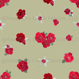 Scattered red roses create a beautiful design on Viridis (golden khaki).