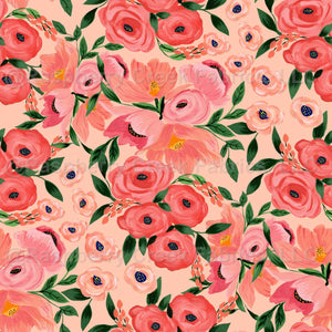 Lush floral pattern featuring vibrant red and peach blooms with rich green leaves, set on a light peach background. Perfect for fabric, wallpaper, and decor.