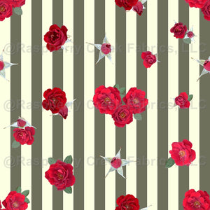 Scattered red roses and rosebuds create a lovely design on Mountain Sage (dark yellow-green) and cream stripes.