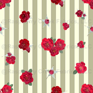 Scattered red roses and rosebuds create a lovely design on Viridis (golden khaki) and cream stripes.