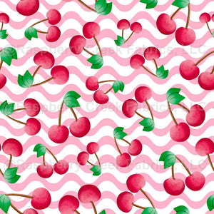 Red Summer Cherries on Pink and White Wavy Stripes