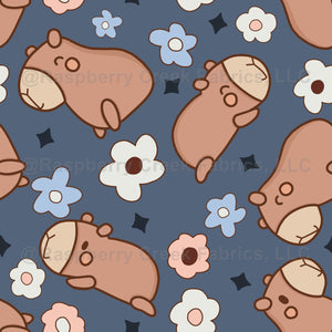 Immerse yourself in the tranquil charm of this whimsical pattern featuring adorable capybaras in various relaxed poses, surrounded by delicate pastel flowers and playful black diamond accents. Set against a calming dark blue background, this design radiates peace and cuteness, making it perfect for cozy home decor, unique fabric projects, or cheerful gift wrap. Ideal for animal lovers and those seeking a touch of whimsy, this pattern is both charming and versatile.