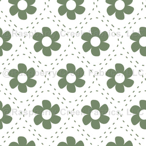 Retro Floral Flower Sage on White, Sage green flowers in diamond geographic with dashed line on white background, small scattered flowers and leaves