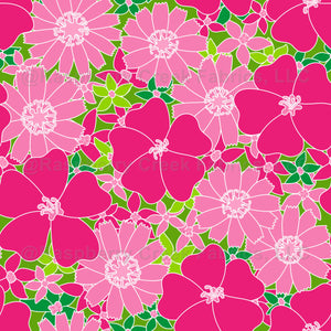 Fun and bright flowers with a retro feel. Pink and green color palette.