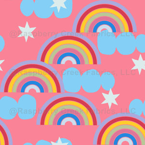 A playful retro-inspired design featuring colorful rainbows, soft blue clouds, and white stars scattered across a warm pink background. Perfect for kids’ fabrics, cheerful home décor, or fun apparel with a nostalgic 70s vibe and a touch of whimsy.