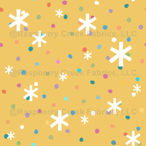 A cheerful mid-century-inspired design featuring bold white snowflakes and colorful confetti dots scattered across a warm mustard yellow background. Perfect for holiday fabric, retro décor, winter apparel, and playful seasonal projects that radiate joy and nostalgia