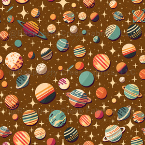 Retro planets shine against a deep brown backdrop.