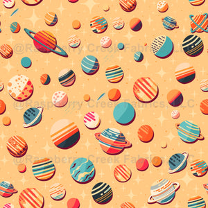 Retro planets shine against a peach orange backdrop. Vintage disco inspired.
