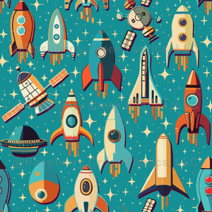 Retro space vehicles, rockets, and UFOs on a captivating teal backdrop.