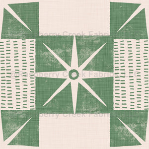 Retro Starburst Quilt Block – Minimalist Mid Century Sage blends classic atomic star motifs with a quilt block layout in a soothing sage green tone. With its hand-textured finish and minimalist mid-century design, this fabric brings soft retro style to quilting, apparel, and home decor projects.